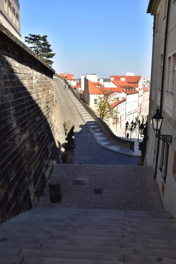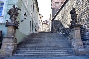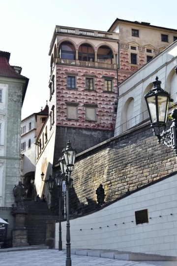 Hradčanské Radnické schody se v seriálu objevují opakovaně. Zřejmě každý fanda si vybaví Claire, jak pod nimi vystupuje z kočáru či jak po nich stoupá. Radnické se jim říká proto, že v jejich horní části stojí Hradčanská radnice. Původně šlo ale o schody, kdy při nich sídlilo hned několik řeznických krámů a říkalo se jim např. Řeznický vršek. Úpatí schodiště dominují dvě barokní sochy, při pohledu od Nerudovy ulice vlevo sv. Josef a proti němu sv. Jan Nepomucký.